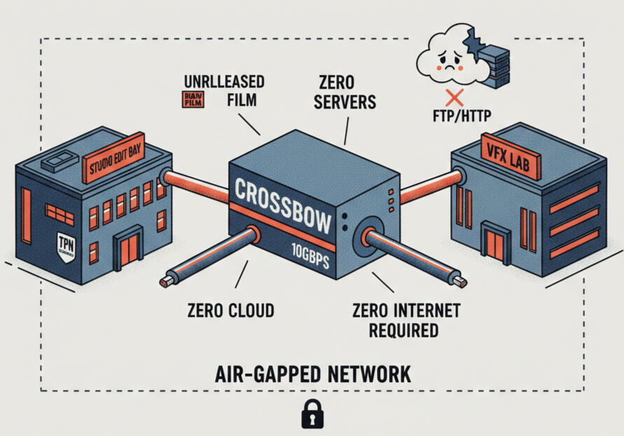 CROSSBOW operates on a strict peer-to-peer model.Your media assets are transferred directly between the sender and receiver without passing through any third-party cloud storage or relay servers.For environments with strict security requirements, transfers can be conducted entirely over private WANs or dark fiber, without requiring a public internet connection.This architecture supports your efforts in meeting rigorous industry security standards.