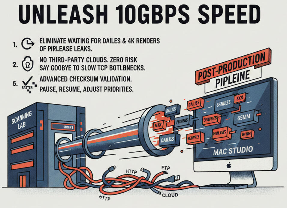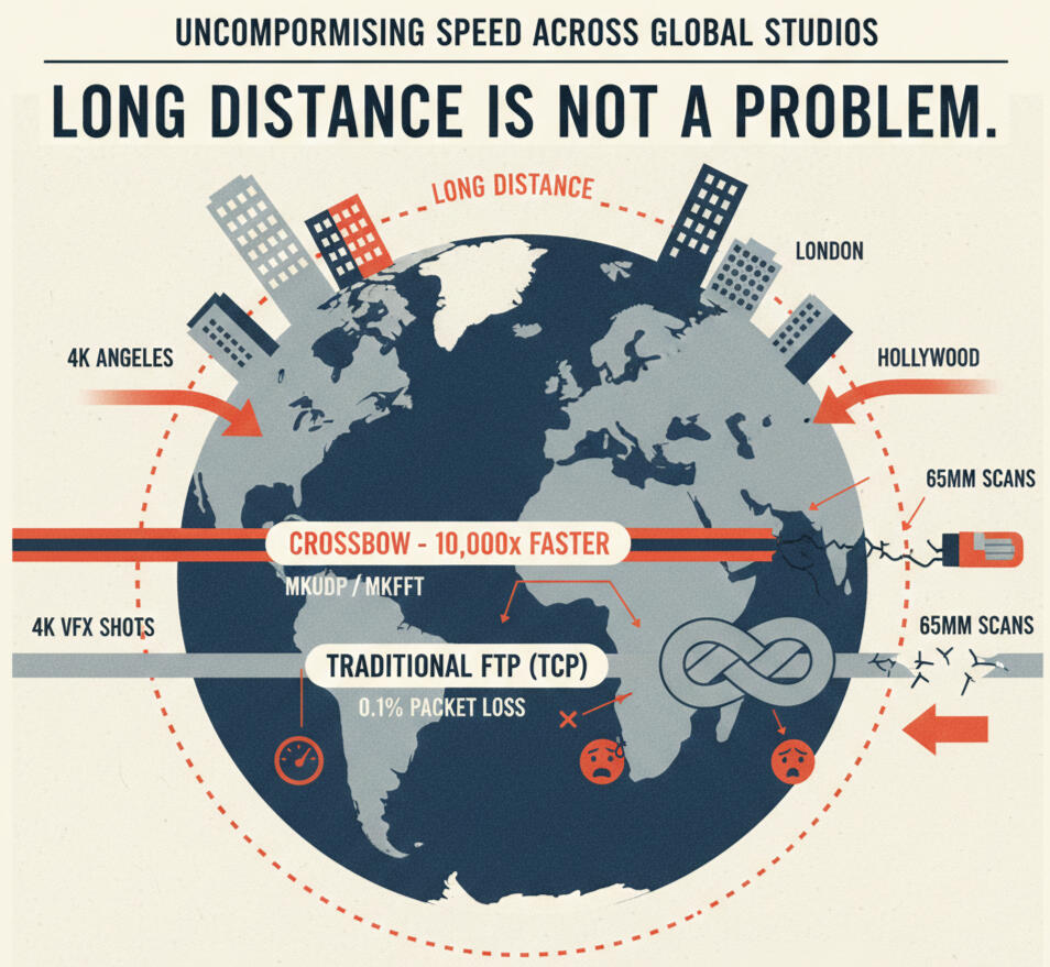 CROSSBOW is designed to maximize your existing network infrastructure, minimizing the time spent moving dailies and uncompressed renders.By utilizing a custom UDP protocol, it mitigates the latency and bottleneck issues common with standard TCP/FTP transfers, especially over long distances.Built-in checksum validation ensures that every EXR and DPX file arrives exactly as it was sent, reducing the need for re-transfers.