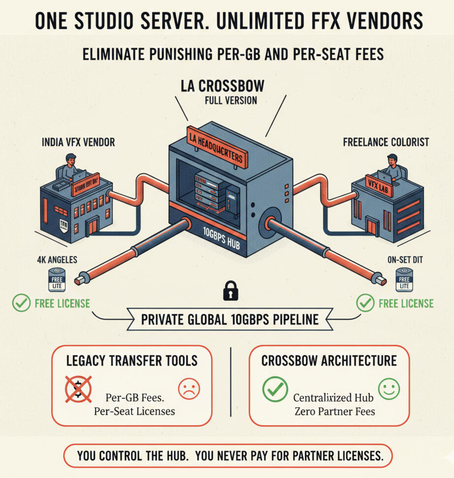 Traditional enterprise tools often penalize growth with per-gigabyte bandwidth fees or per-seat client licenses. CROSSBOW utilizes a hub-and-spoke licensing architecture to minimize friction in global post-production.The Hub: Install the FULL server license at your primary facility or ingest point to handle incoming high-bandwidth transfers.The Spokes: Your external partners—VFX vendors, freelance colorists, and on-set DITs—utilize the complimentary LITE client to send files directly to your hub.You maintain complete control over the central receiving node, while your external vendors connect without requiring additional paid licenses or incurring data transfer costs.